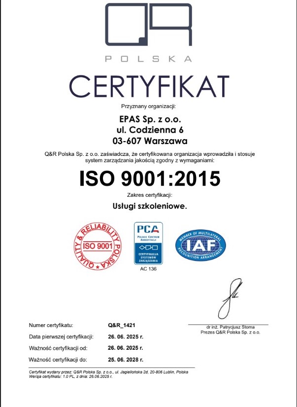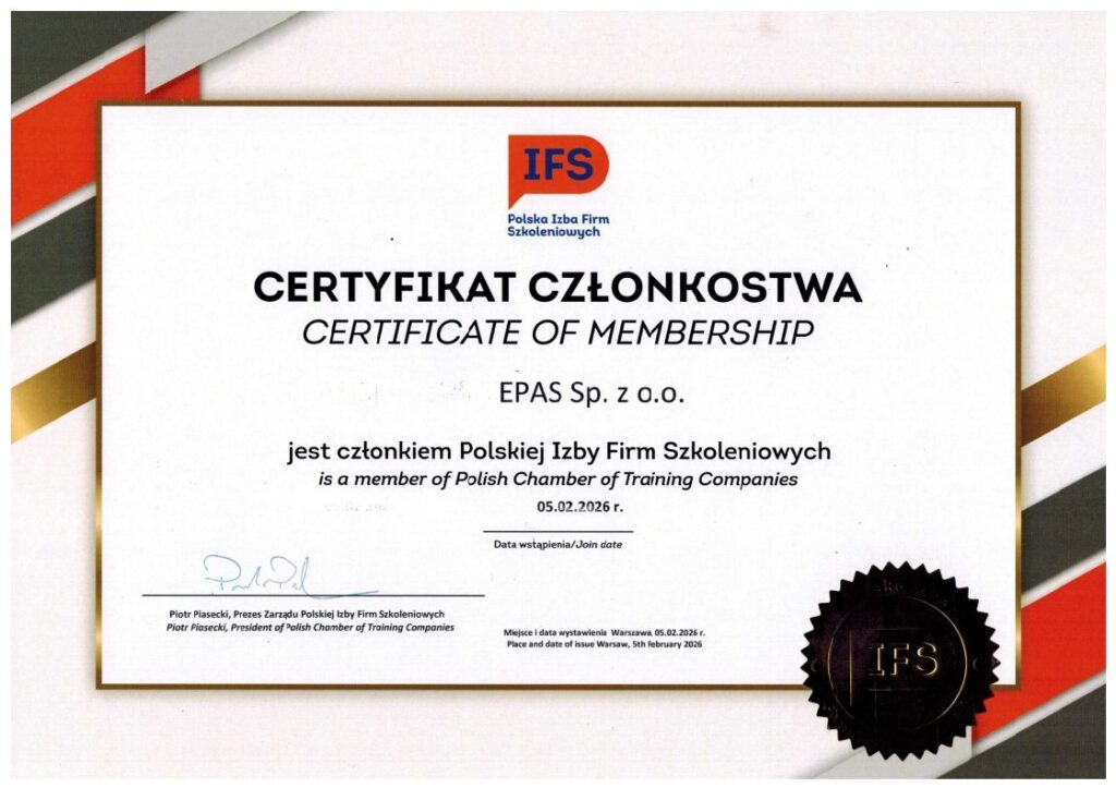 Certyfikaty i dokumenty Posiadamy certyfikat jakości ISO 9001:2015: Jesteśmy członkiem Polskiej Izby Firm Szkoleniowych: